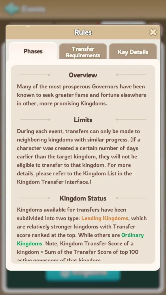 Selama acara tersebut, transfer hanya akan tersedia untuk kerajaan tetangga yang mengalami kemajuan serupa kerajaanmu saat ini. Artinya sebagai berikut