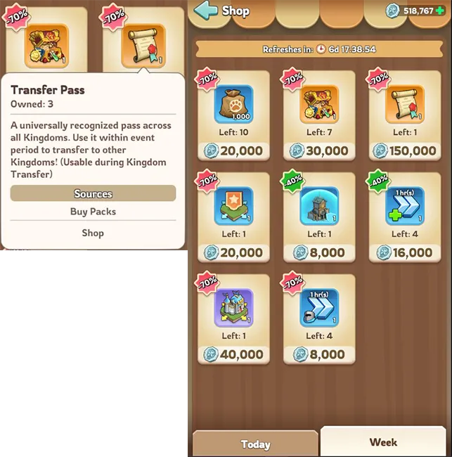 - Beli paket $5 hingga $50 setiap bulan dan hemat tiket Pass untuk berjaga-jaga jika Anda memutuskan untuk melakukannya transfer. Biaya per Transfer Pass jauh lebih murah. Hanya beli paket $100 jika kamu ingin segera keluar dari Kerajaanmu.