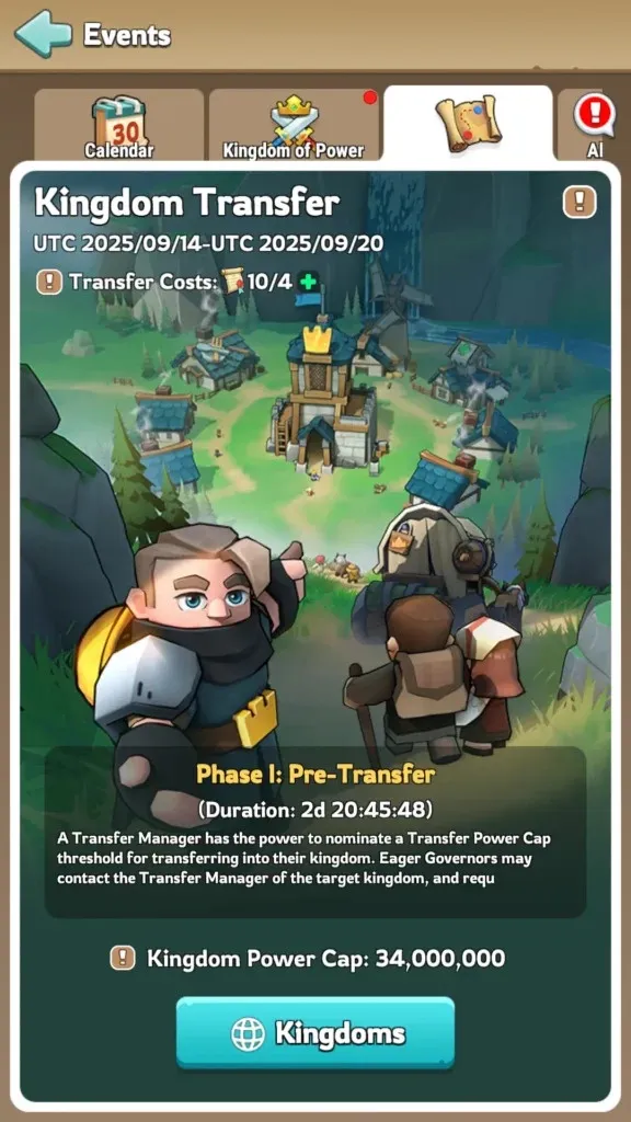 Transfer kerajaan akhirnya ditambahkan ke dalam permainan dengan yang pertama terjadi di antaranya 14/09/2025 hingga 20/09/2025. Peristiwa ini memungkinkan para gubernur untuk memindahkan Kerajaan yang berada di wilayah mereka pengelompokan masing-masing.