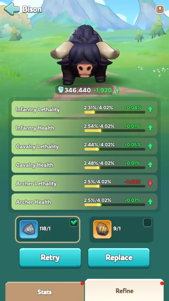 - Hewan peliharaan yang lebih langka menyukainya Badak Raksasa Dan Bison Perkasa memberi lebih baik peningkatan statistik secara keseluruhan melalui penyempurnaan—jadi prioritaskan penyempurnaan terlebih dahulu jika Anda memilikinya.